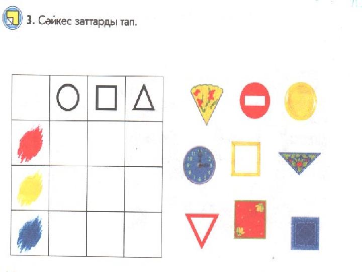 Мақсаты: Геометриялық пішіндерді ажырата білуге ,оларға ұқсас заттарды табуға және пішіні ұқсас затарды орналастырып айта білуге үйрету. Есте сақтау қабілеттерін арттыру