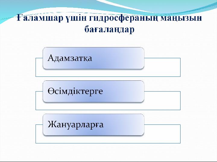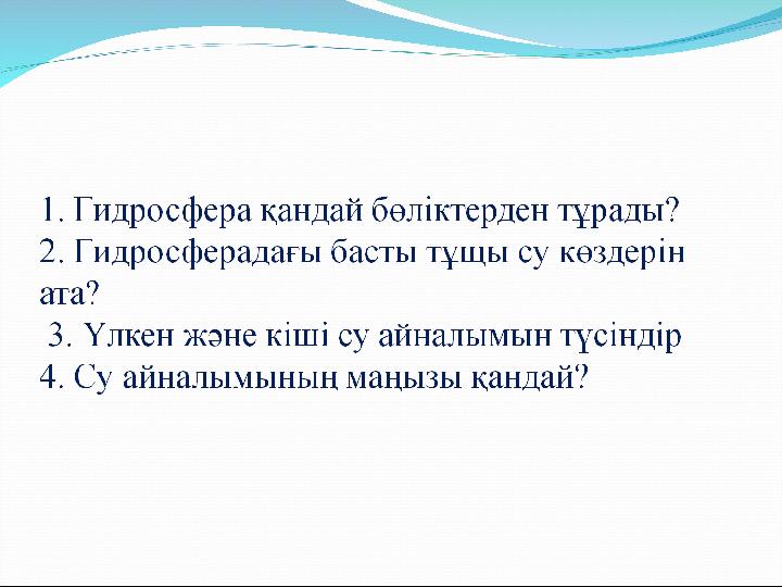 Ой шақыру Табиғатта үш күйде кездесетін зат Гидросфера дегеніміз не? Гидросфераның құрамдас бөліктері қандай? Ғаламшарда ащы су мен тұщы су қалай таралған?