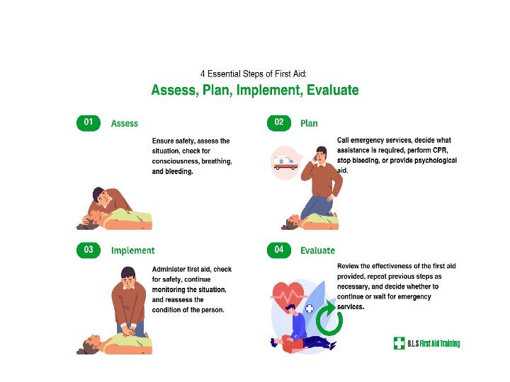 GENERALLY FIVE STEPS ASSOCIATED WITH THE FIRST AID: 1) Assess the surrounding areas. 2) Move to a safe surrounding (if not already; for example, road accidents are unsafe to be dealt with on roads). 3) Call for help: both professional medical help and people nearby who might help in first aid such as the compressions of cardiopulmonary resuscitation (CPR) . 4) Perform suitable first aid depending on the injury suffered by the casualty. 5) Evaluate the casualty for any fatal signs of danger, or possibility of performing the first aid again.