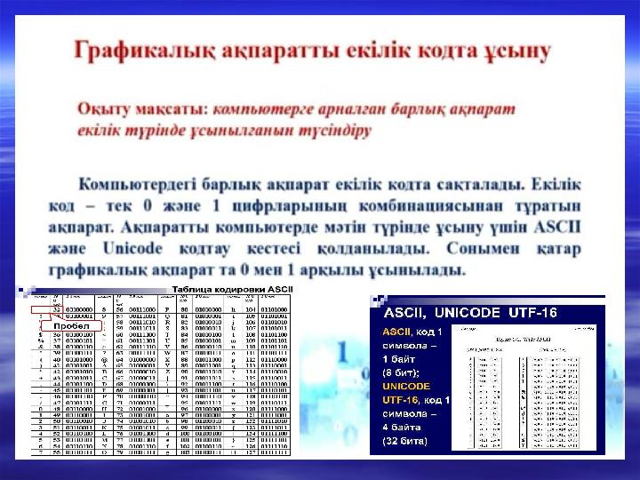 ГрафикалыГрафикалы қ ақпаратты екілік қ ақпаратты екілік кодта ұсыну. Шығармашылық – кодта ұсыну. Шығармашылық – практикалық тапсырмаларпрактикалық тапсырмалар Бұл тақырыпта осы үш түрінің арасынан графикалық ақпаратты аламыз және шығармашылық практикалық тапсырмаларды орындаймыз.Өткен тақырыпта ақпаратты компьютерде екілік кодпен ұсынудың үш түрімен танысқан болатынбыз. ГрафикалыГрафикалы қ ақпаратты екілік қ ақпаратты екілік кодта ұсыну. Шығармашылық – кодта ұсыну. Шығармашылық – практикалық тапсырмаларпрактикалық тапсырмалар