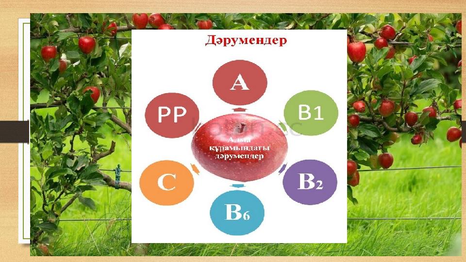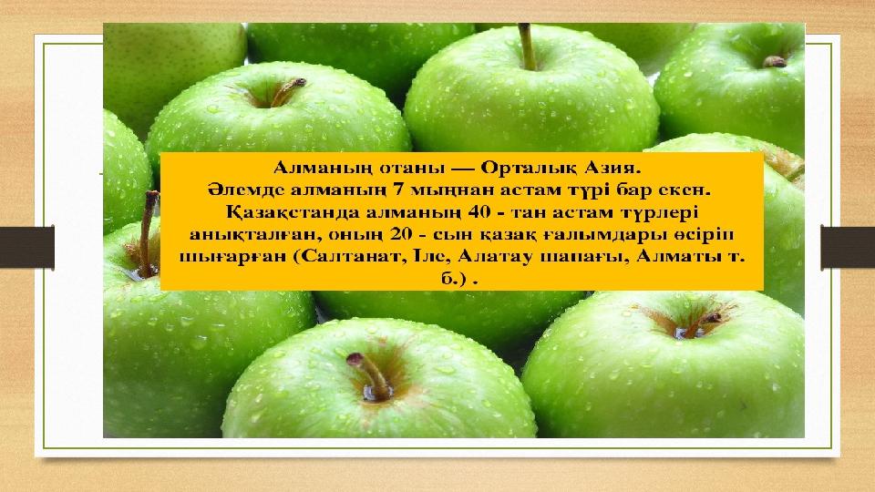 Аннотация Сіздерге ұсынылып отырған өте кең тараған баршаның сүйікті жемісі «Алма» қарастырылып және алманың түрлері мен пайдасы айтылады. Аннотация Рекомендуемый для вас распространенный плод любимый всех «Яблоко» и преимущество, яблоки и о его пользе. Annotation Recommended for you common fruit favorite of all "Apple" and the advantage of apples and its benefits.