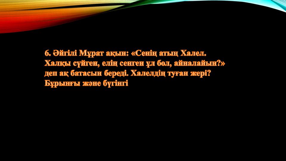 1. Жарлыға сүйеу, төңірегіне тіреу болған атақты Машақ би құтты қонақ келген күні дүние есігін ашқан немересіне ат қоюды ырымдап қонағына ұсынған. Бұл қай күн? Яғни Халелдің туған жылы, айы, күні ?