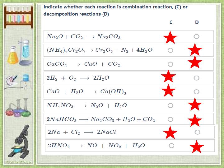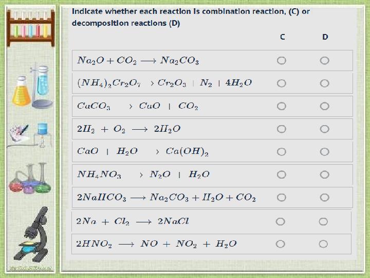 Composition reaction Decomposition reaction Displacement reaction Double displacement reaction 4Li + O 2 → 2Li 2O E N P G FeCl 3+3NaOH→Fe(OH) 3+3NaOH K F D x 2KClO 3 → 2KCl + 3H 2 A c M Н Ca + H 2O → Ca(OH) 2 +H 2 Е J E В 2Al + N 2 → 2AlN L Y S Р CaCO 3 → CaO + CO 2 H l О D Ca(OH) 2 + 2HCl → CaCl 2 + 2H 2O V М R E Zn + 2HCl → ZnCl 2 + H 2 Q W N L NaOH + HCl →NaCl + H 2O A D S T