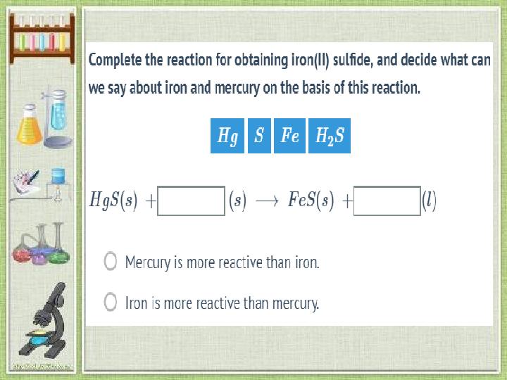 Реакция теңдеуін жазып, теңестіріп, типін анықта/Write down the possible reactions , balance them and identify the type/: 1.Sodium + water →Sodium hydroxcide + hydrogen 2.Iron + hydrochloric acid →iron (II) oxcide +hydrogen 3.Au+ H 2 O→ 4.BaCl 2 + H 2 SO 4 → 1.2Na+ 2 H 2 O→2 NaOH+ H 2 ↑ 2.Fe+2HCl→FeCl 2+H 2↑ 3.Au+ H 2 O→no reaction 4.BaCl 2 + H 2 SO 4 →BaSO 4 +2HCl