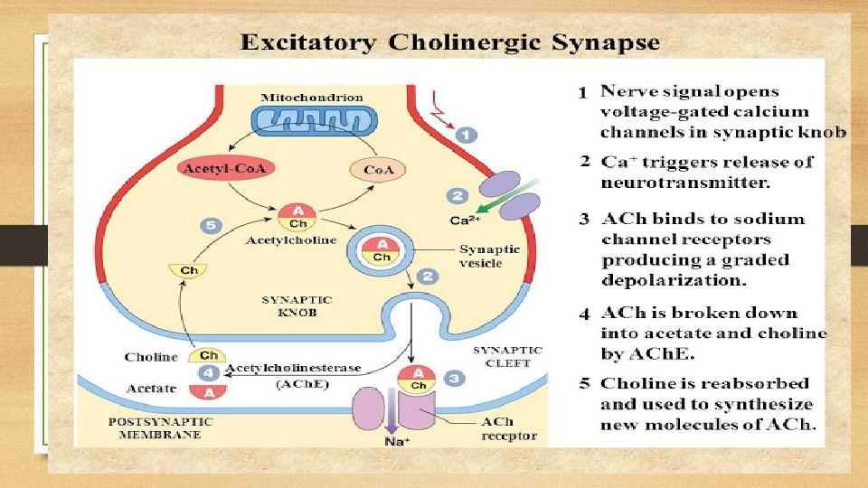 1. Әрекет потенциалы пресинаптикалық нейронға жетеді 2. Са2 + үшін кернеулі каналдардың ашылуын ынталандырады 3. Са2 + пресинаптикалық мембрананың цитоплазмасына таралады 4. Са2 + құрамында ацетилхолин бар везикулалар дың пресинапстық мембранаға жетіп босатылуына ыкпал етеді. 5. Пресинаптикалық мембранаға жетіп везикуладан шыгады 6. Везикула мембранамен бірге сақталады ацетилхолин босатылады және синаптикалық қуыс арқылы таралады 7. Ацетилхолин постсинаптикалық мембранадағы рецепторлық ақуыздармен уақытша байланысады; Na + үшін химиялық жабық иондық каналдардың ашылуын тудырады 8. Na + постсинаптикалық мембрана арқылы таралады, мембрананы деполяризациялайды, әрекет потенциалын жасайды 9. Ацетилхолинэстераза көмегімен катализделген ацетилхолин қайта өңдеу (әсер ету потенциалын үздіксіз өндіруді тоқтатады) 10. Холин пресинаптикалық нейронға оралады Ацетилхолин қайтадан пресинапстық везикулаларға жинақталады.