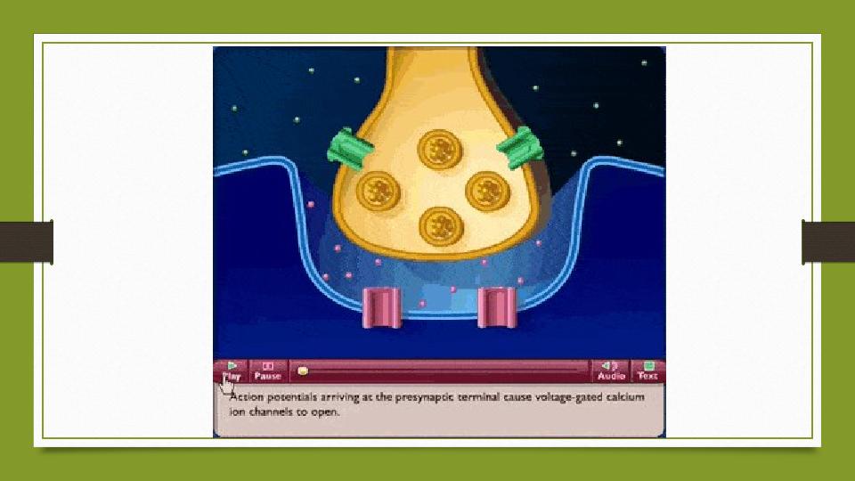 Химиялық синапстар қасиеттері 1. Қозуды бір бағытта берілуін қамтамасыз етеді 2. Синапстық тоқталу болады (0,2 – 0,5 мс) 3. Қозумен қатар тежелуді де қамтамасыз етеді 4. Алдыңғы белсенділігінің іздерін сақтап қала алады (есті қалыптастыруда маңызды) 5. Температураның өзгерісіне тәуелді