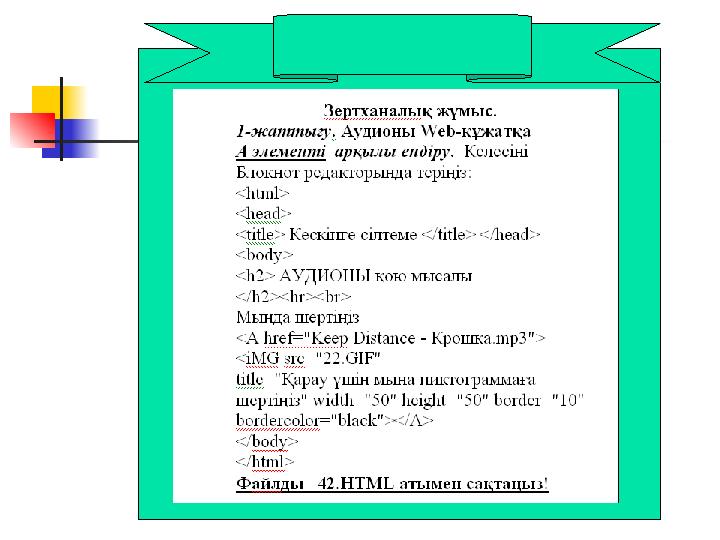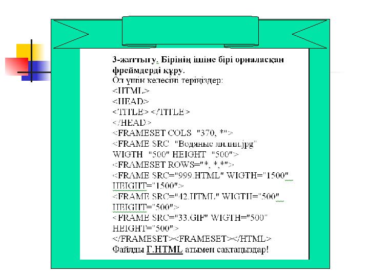 Тәгтердің қосарланып жазылуына мысалдар: <HTML> … </HTML> <B> … </B> <HEAD> … </HEAD> <H3> … </H3> <LI> … </LI> HTML-тәгтерінің жалқы жазылуы: <BR> … <HR> … <FRAME> … HTML-тілінің атрибуттар арқылы жазылуы: <BODY BGCOLOR= “YELLOW” TEXT=“BLUE”> ... <HR COLOR = RED SIZE=16 WIDTH=100%> ...