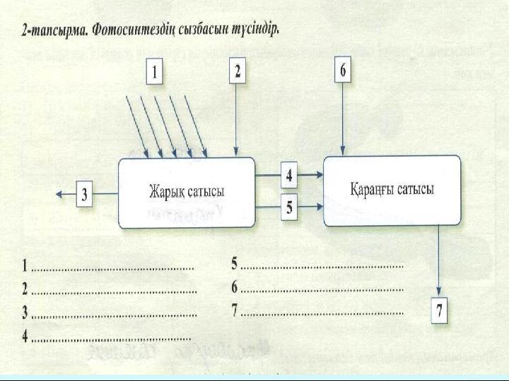 № Сипаты Фотосинтез сатылары Жарық Қараңғы 1 Жарық Жарыққа тәуелді Жарыққа тәуелді емес 2 Температура Температураға тәуелді емес Температураға тәуелді 3 Тездігі Тез (-5) сек Баяу (-2) сек 4 Өтетін орны Мембрана Хлорофилл стромасы
