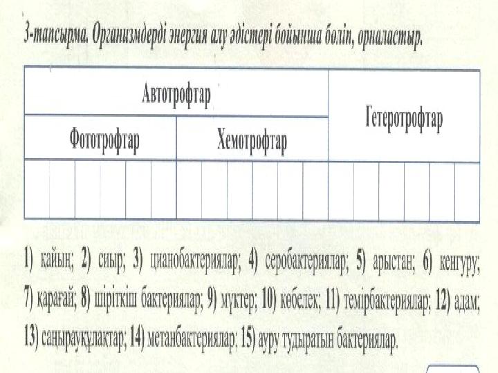 Биологиялық тренажер 1.Ағзалар : 1.1. Жануар 1.2. Өсімдік 1.3 Бактерия 2.Қоректенуі: 2.1. Автотрофты 2.2. Гетеротрофты 3.3 Хемотрофты 3.Өкілдері: 3.1. жусан, бақбақ,қына 3.2.Балық,құс,арқар 3.3 бактериялар, көк-жасыл балдыр 4.Құрлысы: 4.1.крахмал 4.2.нәруыз 4.3. гликоген 5.Қорек түрлері: 5.1. нәруыз,көмірсу,май 5.2. ұсақ ағзалар 5.3 күн энергиясы