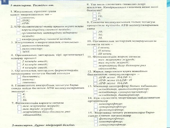 І-топ Метаболизм сатылары ІІ-топ Ағзалардың қоректенуі ІІІ-топ Фотосинтездің жарық және қараңғы сатылары ІV-топ Фотосинтез факторлары Мәтінмен жұмыс