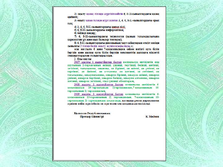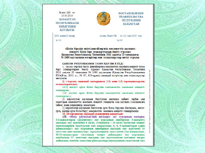 2016 жылғы 13 мамыр №292 «Білім берудің тиісті деңгейлерінің мемлекеттік жалпыға міндетті білім беру стандарттарын бекіту туралы» Қазақстан Республикасы Үкіметінің 2012 жылғы 23 тамыздағы № 1080 қаулысына өзгерістер мен толықтырулар енгізу туралы Әзірлеген: Қызылорда қаласындағы №23 Ж.Қизатов атындағы мектеп-лицей директорының оқу ісі жөніндегі орынбасары Дина Зеиловна Жуматаева