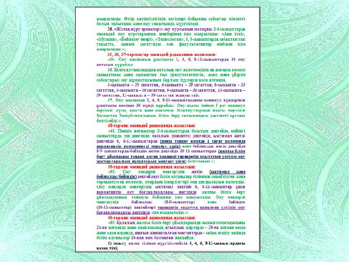 1. Жалпы ережелер Осы жалпы орта білім берудің мемлекеттік жалпыға міндетті стандарты (бұдан әрі – стандарт) «Білім туралы» Қазақстан Республикасының 2007 жылғы 27 шілдедегі Заңының (бұдан әрі – Заң) 56-бабына сәйкес әзірленді және білім алушылар мен тәрбиеленушілердің дайындық деңгейіне, білім берудің мазмұнына, оқу жүктемесінің ең жоғары көлеміне қойылатын талаптарды айқындайды. Жалпы орта білім берудің жалпы білім беретін бағдарламаларын іске асыратын білім беру ұйымдары (бұдан әрі – білім беру ұйымдары) меншік нысаны мен ведомстволық бағыныстылығына, сондай-ақ оқыту тіліне қарамастан білім беру қызметін: 1) осы стандартқа; 2) оқу бағдарламалары мен үлгілік оқу жоспарларына; 3) Қазақстан Республикасының білім беру саласындағы уәкілетті органы белгілеген тәртіппен бекіткен басқа да нормативтік құқықтық және құқықтық актілерге сәйкес жүзеге асырады.
