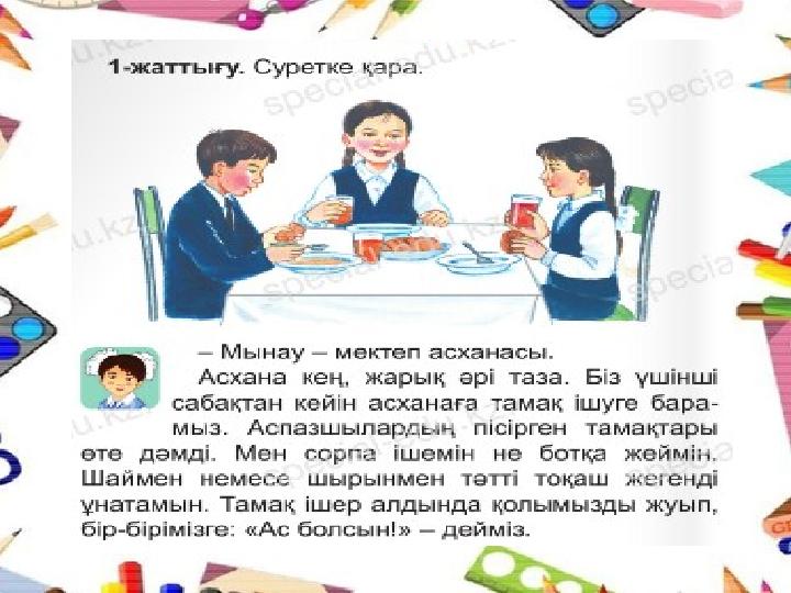 1) Асханаға кірерде не істеу керек? 2) Түскі асқа қандай тағам аласың?1-тапсырма: өз ойыңмен бөліс. 2-тапсырма: «Дауыстылырды та