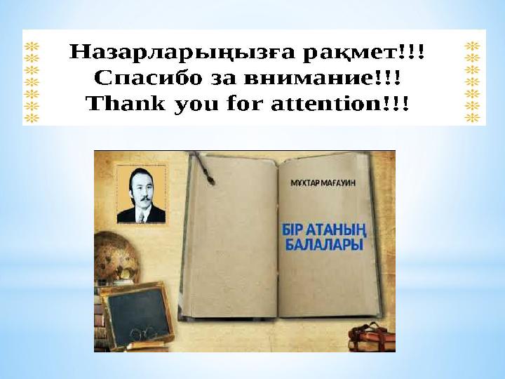 5- сынып Мұхтар Мағауин «Бір атаның балалары» шығармасы – тәрбиелік маңызы зор шығарма Бір атаның балалары шығармасы –соғыс жылдарында әртүрлі ұлттан шыққан жетім балаларды бауырына басқан қазақ халқының кеңпейілдігі мен адамгершілігін көрсететін туынды. Ахмет шал- мейірімді,адамгершілігі мол, қиын заманда да өз ұстанымынан айнымайтын дана қария. Ол жетім қалған балаларға қамқор болып, ұлттық құндылықтарды сақтаудың үлгісін көрсетеді. Зигфрид- соғыс салдарынан тағдыр тәлкегіне түскен, қазақ жеріне келген неміс баласы. Ахмет шалдың тәрбиесін көріп, мейірім мен адамдықты бойына сіңіреді. Ол өзге ұлт өкілі болса да, қазақ халқының кең пейілі арқылы рухани жақындық табады. ТАПСЫРМАЛАР: 1-топ: неміс баласы Зигфридтің портретін жаз 2-топ: Зигфрид туралы постер жаса 3-топ: Ахмед шал Зигфридке асық жілік сүйегін неге берді деген сұраққа жауап іздейді