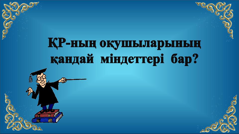 Әрбір оқушы ҚР-ның Конституциясы мен заңдарын сақтауға Басқа адамның құқықтарын, ар- намысы мен қадір-қасиетін сақтауға Табиғатты қорғауға Тарихи мәдени мұраларды сақтауға міндетті.
