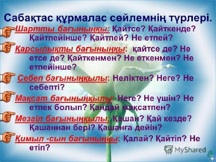Тест жұмысы 1. Құрмалас сөйлемді көрсетіңіз А) Құстар жылы жаққа ұшып кетті. В) Көктемде қар ериді. С) Жаз келіп, жасыл шықты. Д) Күзде күн қысқарады, салқындайды. 2. Шартты бағыныңқылы сабақтас құрмаласты табыңыз А) Қына тасқа бітсе,білім басқа бітеді. В)Күн бұлттанып еді,- жаңбыр жаумады. С)Ол ерте келгенімен, ешкім көрмеді. 3. Сабақтас құрмалас сөйлем қандай сөйлемдерден тұратынын анықтаңыз. А) Жай, күрделі. В) Бағыныңқы, басыңқы. С) Сұраулы, лепті. D) Лепті, хабарлы. Е) Бұйрықты, сұраулы. 4. Сөйлемнің түрін анықтаңыз. Сабақ кестесін өзгертсе, бізде кітапханаға баратын уақыт болады. А) Жай сөйлем. В ) Атаулы сөйлем. С ) Сабақтас құрмалас сөйлем. 5. Шартты бағыныңқы сабақтастың жасалу жолын анықтаңыз. А) -са, -се. В) –ғандықтан, -гендіктен. С) –ғанда, -генде. D) – мақшы, -мекші+болып. E) – ғанмен, -генмен. 6. Құрмалас сөйлем түрлерін анықтаңыз. A) Салалас, сабақтас, аралас. B) Жақты , жақсыз. C) Толымды, толымсыз. D) Жалаң, жайылма. E) Хабарлы, сұраулы. 7. Шартты бағыныңқы құрмалас сөйлемнің жұрнағын анықтаңыз. A) – ған, -ген. B) – са, -се. C) – ып, -іп,-п. D) - у. E) – қан, -кен.