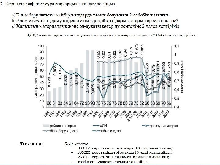 Адам потенциалының даму индексі Білім Лайы ты мір қ ө с ру де гейі ү ңза ж не Ұ қ ә салауатты мір ө Болжаулы өмір ұзақтығы (туылғанда) Ересек тұрғындардың білім деңгейі ЖОО түскендердің жалпы коэффициенті Жан басына шаққандағы ЖІӨ Білім индексі ЖІӨ индексіӨмір ұзақтығының индексі Адам потенциалыны даму индексі ң Ересек тұрғындардың білім индексі ЖОО т скендерді жалпы ү ң коэффициентіні индексі ң
