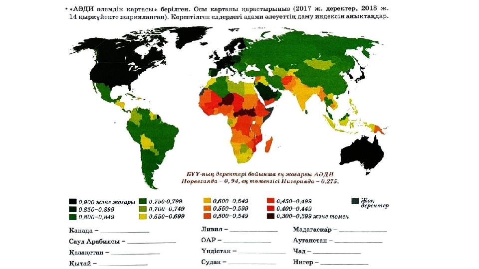 География Елдердің АДИ көрсеткіштерін салыстыру 2017ж жарияланған рейтингке 186 ел, Гонконг, Палестина кіргенАДИ негізінен елдердің арасындағы айырмашылықты анықтау АДИ көрсеткіші бойынша 4 топқа жіктеледі: өте жоғары, жоғары, орташа, төмен. Елтану индекстер мен рейтингтар Орташа АДИ көрсеткіші 0,694 Бұұ ДБ 2017ж. АДИ рейтингісінде Қазақстан 0,800 көрсеткішімен 52 орын