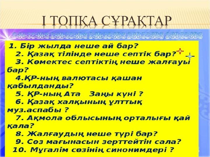 Мақсаты: 1.Білім жарыстырып, ой шапшаңдығын, дүниетаныммен кеңейтіп, тілін дамытады.2.Білімге деген қызығушылығы артады.3.Ұ йы м ш ы лды ққа, ізденім пазды ққа, ш ы ғарм аш ы лы ққа т әрбиеленеді.