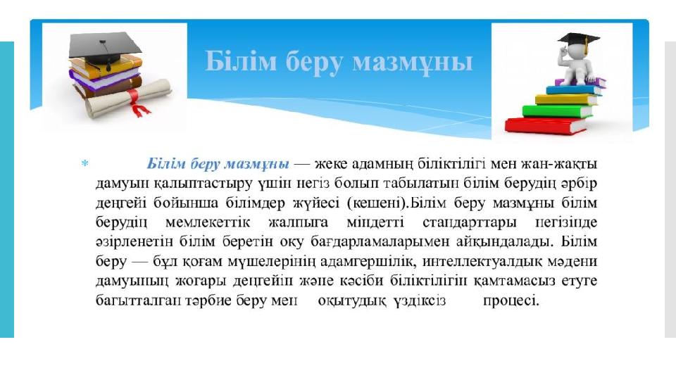 Атал ғ ан құ жат республикада ғ ы бі л і м саясатын жузеге асыруды қ амтамасыз етет і н стратегиялык ма ң ызды құ жат. Стандартт ың нег і зг і қ ызмет! - бас қ ару. Ол "Б ілі м туралы” За ңғ а с ә йкес жасалады.