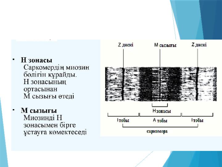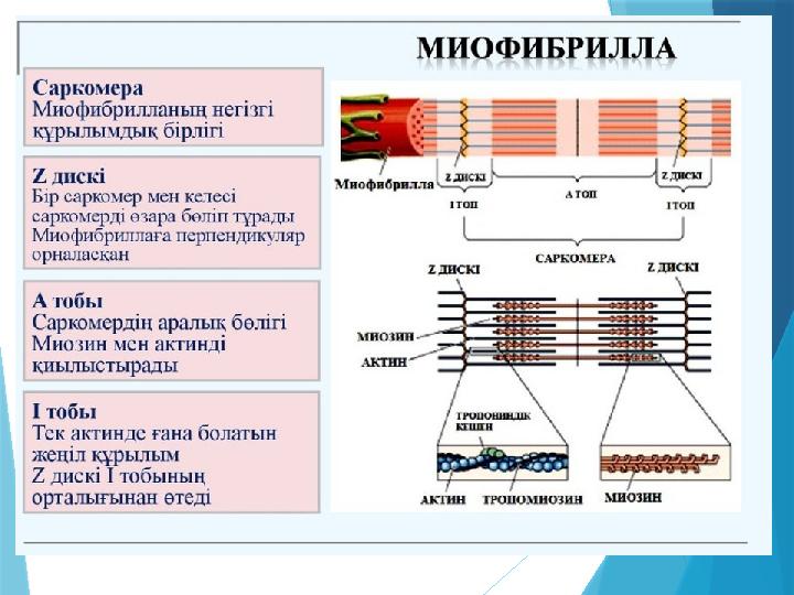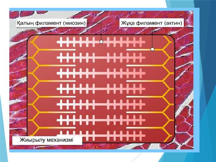 Миофибриллалар Әрбір миофибрилла мыңдаған қайталанып отыратын саркомер деп аталатын аймақтан тұрады. Әрбір саркомерде жуан және жіңішке филаменттер бар: • Ж іңішке филаменттердің аймақтары ( қызғылт жіпшелер ) • Жуан филаменттердің аймақтары ( күлгін жіпшелер ) • Жуан да, жіңішке де филаменттері бар аймақтар