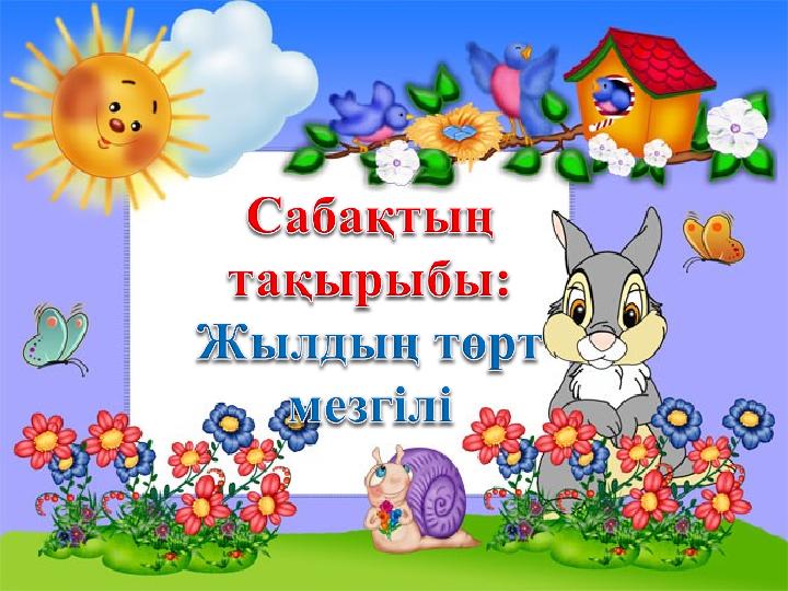 Тыңдалым мәтіні Ерте – ерте ертеде атақты Жыл атасының Қыс, Күз атты екі ұлы және Көктем, Жаз атты екі қызы болыпты. Балалары өсіп, ер жеткен соң оларды жиып алып Жыл атасы былай депті: Балаларым, сендер үлкен азамат болдыңдар, ақылдарың толды. Енді барып халыққа қызмет етіңдер. Төрт мезгілді үш – үштен бөліп алып, кезекпен үш айдан өз міндеттеріңді атқарыңдар депті. Бірақ бір ескертерім: Әрқашан халық үшін, адам үшін жұмыс істейтіндеріңді ұмытпаңдар, - деді.