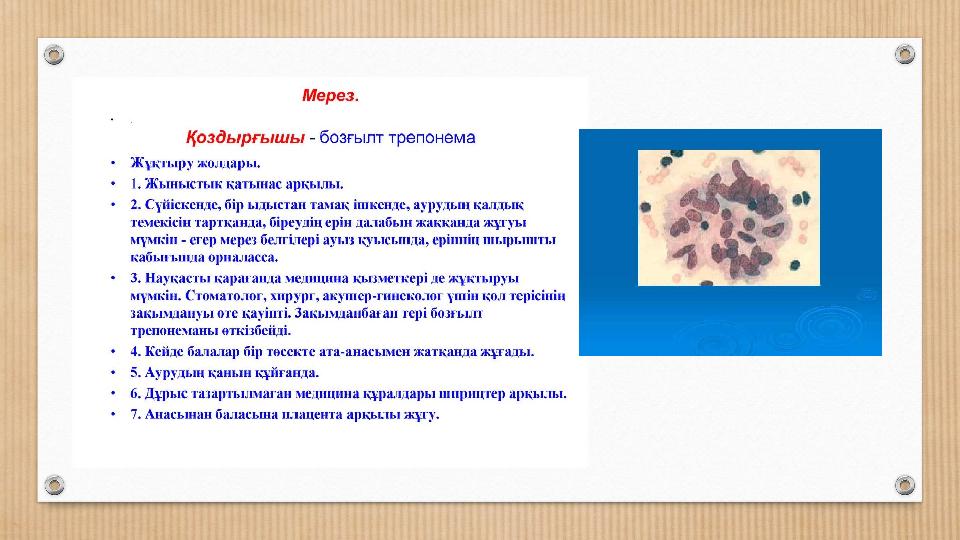 Мерез немесе Сифилис • Бұл дертті негізінен арнаулы микробтар таратады. Әсіресе спирохеттер ( S рігоһе t а) микроскоппен ғана көруге болады. Сырт пішіні — штопырға ұқсас бұралып келеді. Бұл микроб жыныс ауруының қандай түрі болмасын барлығын жұқтырады. Денені қызарады, жара пайда болып кейіннен іріндейді.Біраз уақыт өткеннен кейін (6 аптадан 1 жылға дейін), де-ненің кез келген жері бөртіп, қызарып кетеді. Бөрткені ауырмайды, не қышымайды. Жалпы адамды мазаламайды. Бұл аурудың осы кездегі белгілері, бұрынғы кездегілермен салыстырғанда мүлдем басқаша. Таңба-таңба болып шаштың түсуі, тамақ қы-рылдап қалады», адамның басы ауырып температурасы көтеріледі. Бірақ бұл белгілер болмауы да мүмкін. Егер сифилисті емдемесе, ол адам ағзасына төтенше құбылыстар туғызуы сезсіз. Сал ауруы (паралич), көзі көрмей соқыр болып қалуы, құлағы естімей саңырау болып қалуы, адам есінен мүлдем айрылып кетуі, тіршілік дүниесімен қоштасуы ықтимал. Сифилисті емдеу үшін ең кең қолданылатын дәрінің бірі антибиотик — пенициллин. Ол төмендегі сатыдағы саңырауқұлақтардан өндіріледі (Репі s е llinum). Сифилис жүкгі анадан туылатын балаға тарауы сөзсіз. Ол ауру болып туады. Сүйектері кемтар болып дүниеге келеді.
