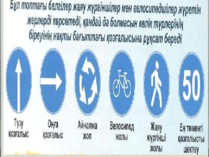 «Нұсқау белгісі» Белгімін көрсетер жылдамдық, бағытты, Ой-шұңқыр, бұрылыс, қатерді, қауіпті. Барлығын анықтап көрсетіп жіберем, Сондықтан бәрі де мені тез таныпты. Нұсқау белгілері – бұл топтағы белгілер жаяу жүргіншілер мен велосипедшілер жүретін жерлерді көрсетеді, қандай да болмасын көлік түрлерінің біреуінің нақты бағыттағы қозғалысына рұқсат береді.