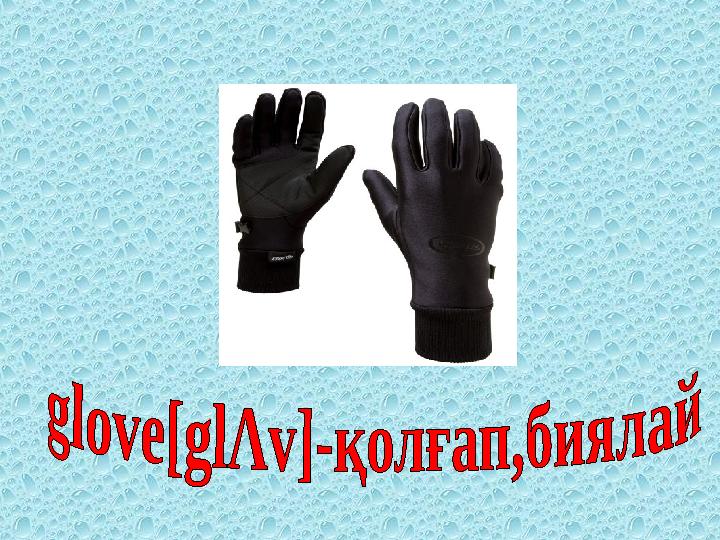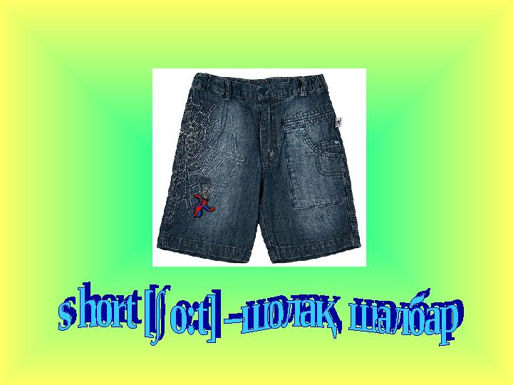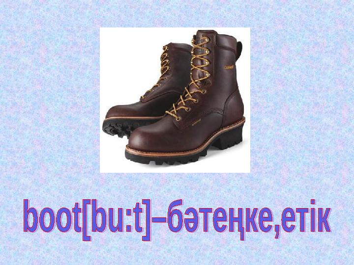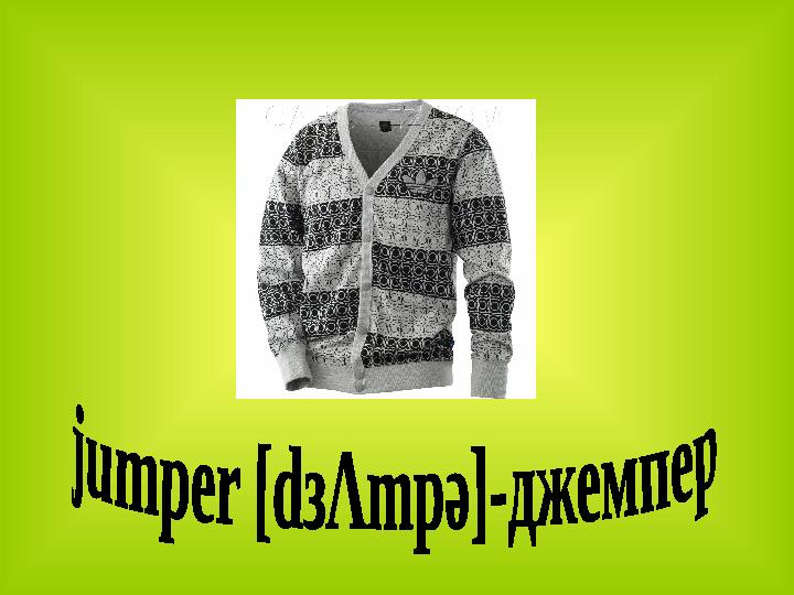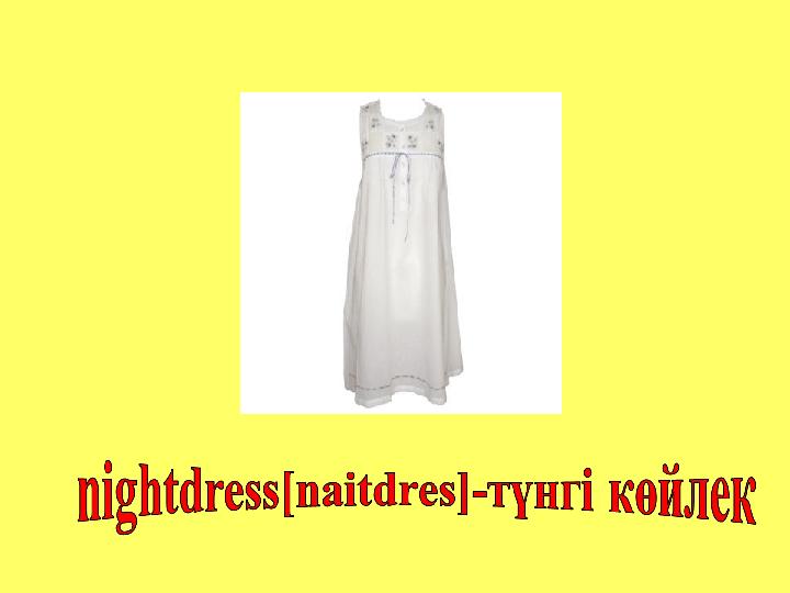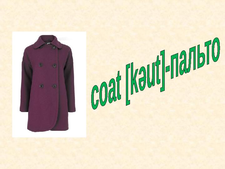 coat [kәut]-пальто glove [gl/\v]-биялай,қолғап. stocking [stokin]-шұлық boot [bu:t]-бәтіңке ,етік short [∫o:t]-шорт,шолақ шалбар jumper [dз/\mpә]-джемпер nightdress [naitdres]-пижама