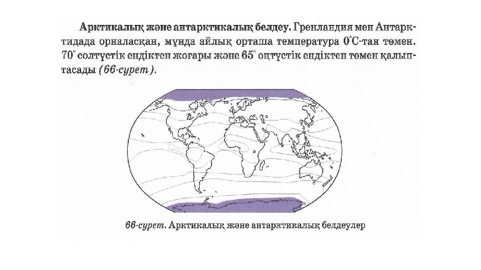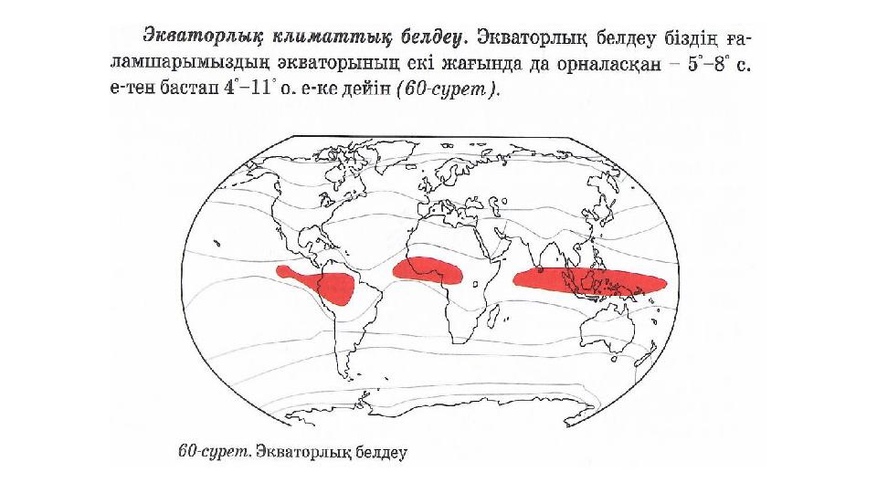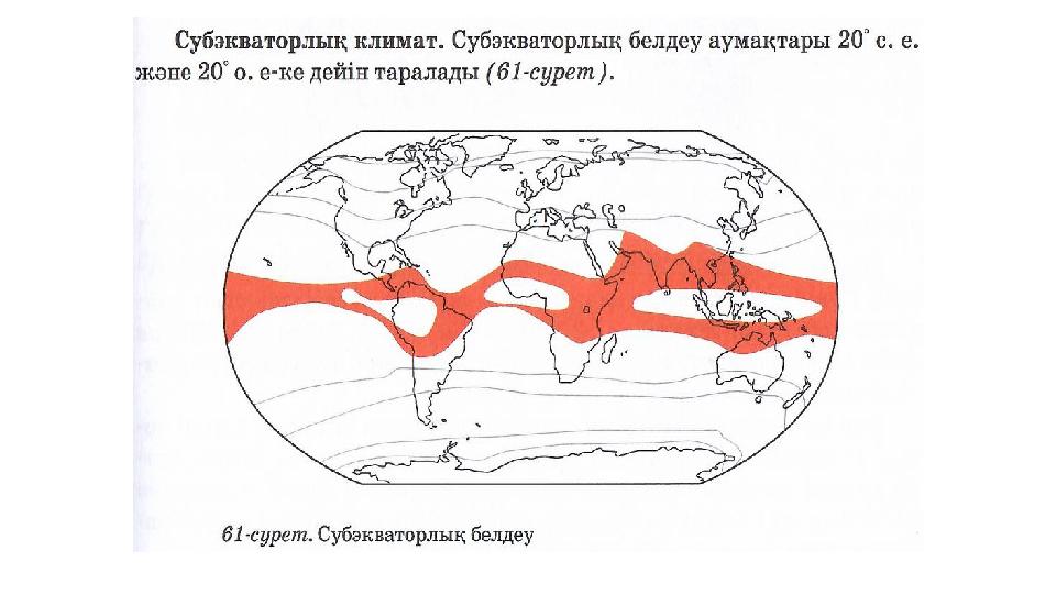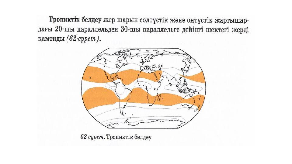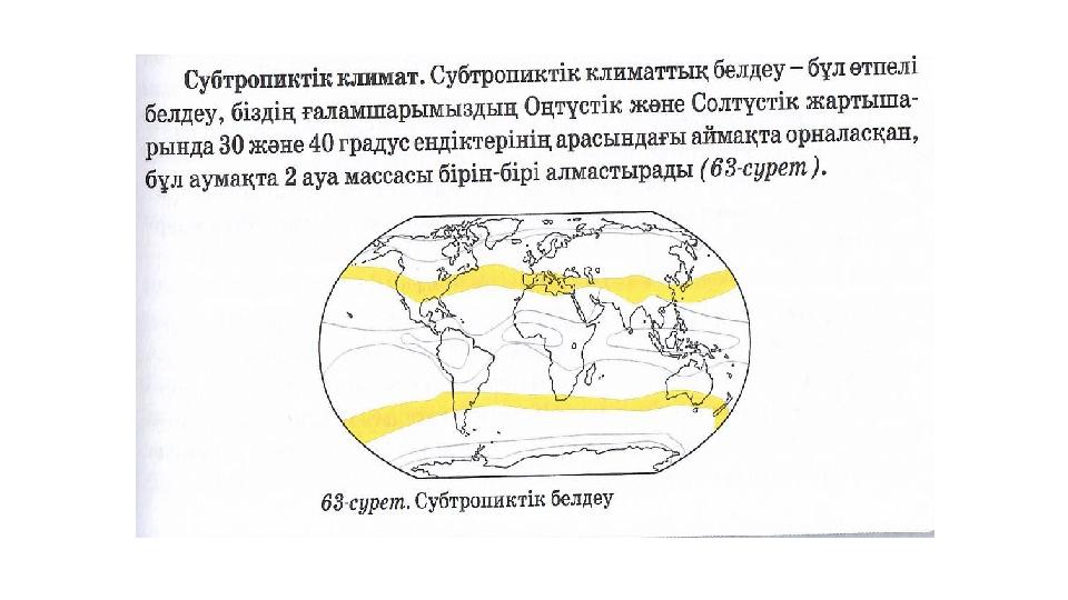 ЕСКЕ ТҮСІРУ •Қандай климаттық белдеулерді білесіздер? •Экваторлық, тропиктік, қоңыржай, арктикалық (антарктикалық) •Климаттық белдеулер бір-бірінен қалай айырмашылық жасайды? •Ауа массалары, t°, жауын-шашын мөлшері, қысым т.б.