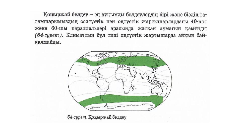 Бейнефильм: Климаттық белдеулер •Оқушылар өздері білетін климаттық белдеулерді атайды. Олар негізгі белдеулер мен өтпелі климаттық белдеулерді анықтайды.