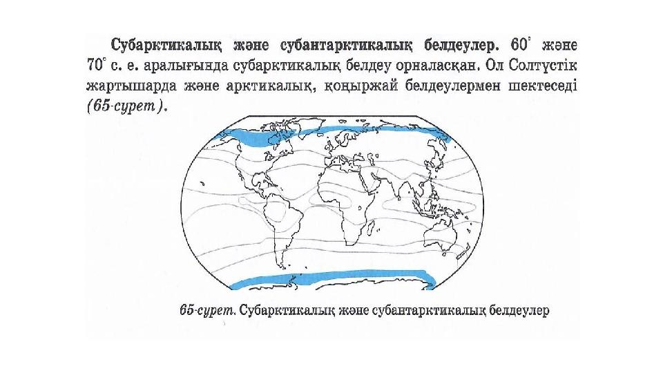 Бекіту тапсырмасы Келесі сипаттамалар қандай белдеуге көбірек тән: а) жылы әрі ылғалды; ә) жылы әрі құрғақ; б) айрықша ылғалды, ауа температурасы мезгіл бойынша күрт өзгеретін; в) суық әрі құрғақ? Оқушылар қай белдеу екенін табады