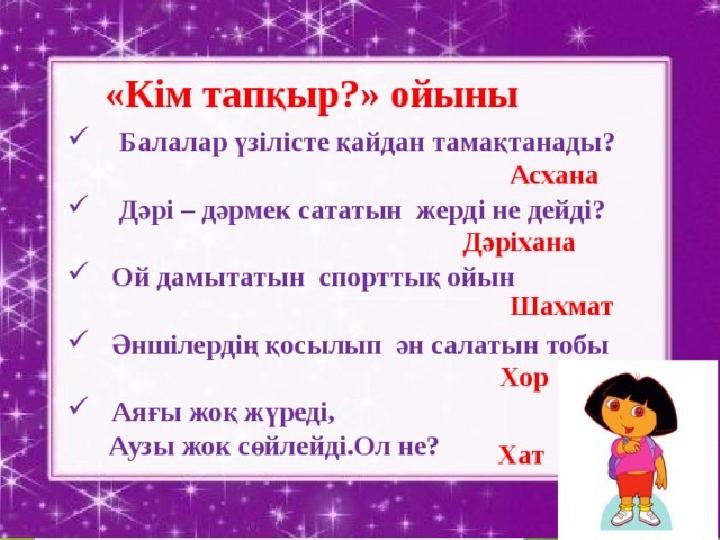 Б а л а л а р , б ү г і н б і з д е р қ а н д а й д ы б ы с т а р д ы ө т е м і з ? С у р е т т е қ а н д а й д ы б ы с т а р б е л г і л е н г е н ?