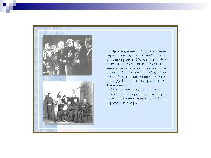 Использованные ресурсы: http://900igr.net/prezentatsii/literatura/Gogol-1/016-Proiz vedenie-N.V.-Gogolja-Revi-zor-imejuscheesja-v-bibliotek e-izdano.html http://www.libex.ru/?cat_page=0&pg=6639 http://www.libex.ru/ppl/usr6107/?pg=0 http://www.book-illustration.ru/books/korovin.html http://www.audiobooks.ua/izbrannye-povesti-komediya-r evizor-38195.html http://www.labirint.ru/screenshot/goods/66711/6/ http://illustrada.ru/?p=4522 http://artsait.ru/foto.php?art=b/boklevsky/img/4 http://top.oprf.ru/blogs/311/10220.html http://il.rsl.ru/html/010/j00994.html