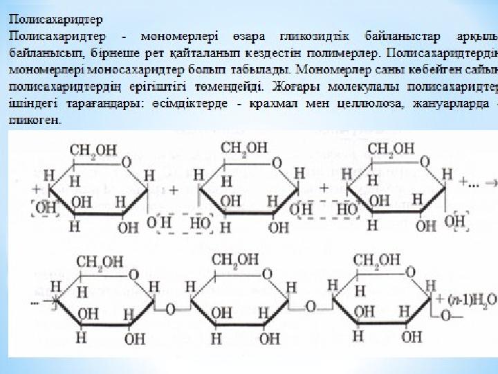 Күнделікті азықтың 60%-ы көмірсудан тұрады Күнделікті азықтың 60%-ы көмірсудан тұрады Көмірсулар Көмірсулар Азық құрамында көмірсудың жетіспеушілігі зиян және ол ағзадағы нәруыз бен майлардың энергиясын қарқынды пайдалануға әкеледі. Олардың ыдыруы нәтижесінде адам ағзасына зиянды заттар саны артады. Азық құрамында көмірсудың жетіспеушілігі зиян және ол ағзадағы нәруыз бен майлардың энергиясын қарқынды пайдалануға әкеледі. Олардың ыдыруы нәтижесінде адам ағзасына зиянды заттар саны артады. Құрамы бойынша жіктеледі Құрамы бойынша жіктеледіКүрделі крахмал (С 6 Н 10 О 5 ) n Күрделі крахмал (С 6 Н 10 О 5 ) nЖай глюкоза С 6 Н 12 О 6 Жай глюкоза С 6 Н 12 О 6Олардың құрамында екі функциональды топ болады: 1) Гидроксо топ, құрылымдық (структуралық) формуласы -ОН 2) Карбониль топ, құрылымдық (структуралық) формуласы - НС=О Олардың құрамында екі функциональды топ болады: 1) Гидроксо топ, құрылымдық (структуралық) формуласы -ОН 2) Карбониль топ, құрылымдық (структуралық) формуласы - НС=ОТағам құрамындағы көмірсулардың көп болуы зиян, ол семіздікке әкеледі. Қантты мөлшерден тыс көп қабылдау ішек микрофлорасы функциясына кері әсер етіп, холестериннің алмасуын бұзады және қан сары суында оның мөлшерінің көбеюіне әкеледі. Тағам құрамындағы көмірсулардың көп болуы зиян, ол семіздікке әкеледі. Қантты мөлшерден тыс көп қабылдау ішек микрофлорасы функциясына кері әсер етіп, холестериннің алмасуын бұзады және қан сары суында оның мөлшерінің көбеюіне әкеледі.Көмірсулар адам ағзасында қорға жиналуы мүмкін! Көмірсулар адам ағзасында қорға жиналуы мүмкін!глюкоза С 6 H 12 O 6 глюкоза С 6 H 12 O 6Көмір қышқыл газыСО 2 мен суға Н 2 О ыдырайды және энергия бөледі (1 г. көмірсу – 4,1 ккал.) Көмір қышқыл газыСО 2 мен суға Н 2 О ыдырайды және энергия бөледі (1 г. көмірсу – 4,1 ккал.)