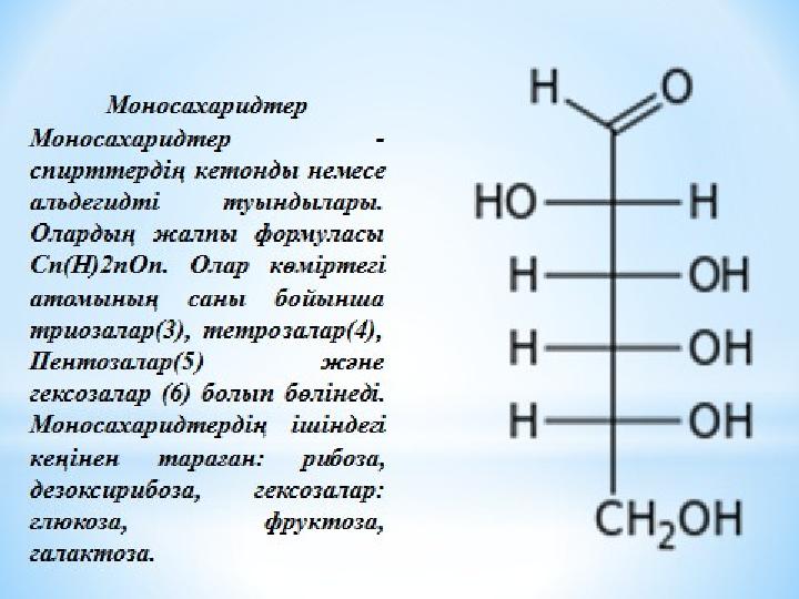 Көмірсулар– жартылай функциональды қосылыстар Бұлар молекула құрамында көміртек, сутек және оттек атомдары болатын, сонымен бірге ондағы сутек пен оттек атомдарының қатынасы дәл су молекуласындағыдай (2:1) болып келетін органикалық заттар. Көмірсулардың жалпы формуласы - С n (H 2 O) m