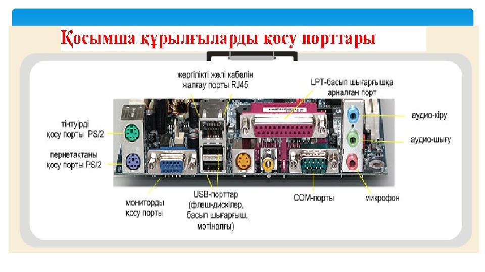 Дыбыстық адаптер Дыбыстық адаптер – құрамына дыбыстық процессор мен басқа да көмекші құрауыштар кіргізетін құрылғы Қоректендіру блогы Қоректендіру блогы – 220 В айнымалы тоқ көзінен алынған кернеуді компьютердің ішкі құрылғылары жұмыс істейтін 5В, 12В кернеу режиміне ауыстыратын құрылғы