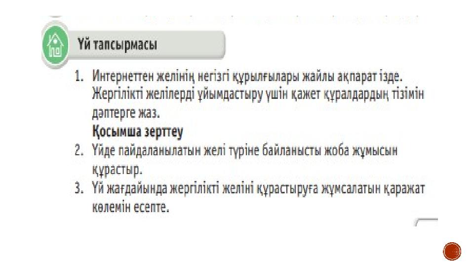 ОҚУЛЫҚТАҒЫ МӘТІНМЕН ЖҰМЫС Желі ұғымы саған таныс па? Желінің қандай түрлерін білесің? Компьютерде желі құру үшін қандай құрылғылар қажет? Компьютер желілерінің бір бірінен ерекшелігі неде? «Желі топологиясы» дегеніміз не? «ДЖИГСО» әдісі