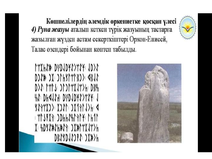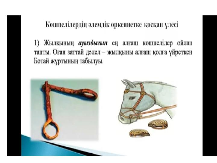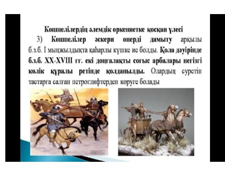 Көшпелілердің әлемдік өркениетке қосқан үлесі • Ат үстінде жүрген көшпенділер тақымына басқан сәйгүлігіне неғұрлым еркін мініп жүруі үшін биік ер-тұрман мен үзеңгіні ойлап тапты. Бұл жаңалық салт атты адамның ат үстінде қаққан қазықтай мығым отыруына, сонымен бірге шауып бара жатып, қолындағы қаруын еш қиындықсыз және неғұрлым тиімді қолдануына мүмкіндік берді. Бабаларымыз шапқан аттың үстінен садақ тартуды барынша жетілдірді. Соған байланысты қарудың құрылымы да өзгеріп, күрделі, ыңғайлы әрі қуатты бола түсті. • Қазақстан аумағында өмір сүрген түркі тайпалары ойлап тапқан тағы бір технологиялық жаңалық - қылыш. Оның оқтай түзу немесе иілген жүзі - ерекше белгісі. Бұл қару ең маңызды әрі кең таралған соғыс құралына айналды. Сарбаз бен оның мінген атын қорғауға арналған сауытты да алғаш рет біздің бабаларымыз жасаған. Еуразия көшпенділерінің айрықша маңызды әскери жаңалығына баланған мұздай темір құрсанған атты әскер осылайша пайда болды.