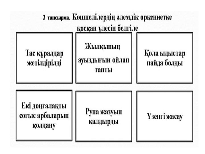 Сабақтың тақырыбы:Көшпелі мал шаруашылығының қалыптасуы Сабақтың мақсатты: Көшпелілердің әлемдік өркениетке қосқан үлесін білу