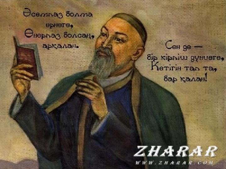 Кел, жастар, біз түрлі жол табалық, Арам, айла, зорлықсыз мал табалық Өшпес өмір, таусылмас мал берерлік, Бір білімді данышпан жан табалық… Жүз айтқанмен, өзгенің бәрі надан, Жалынарлық Абайға, жүр, барарлық.