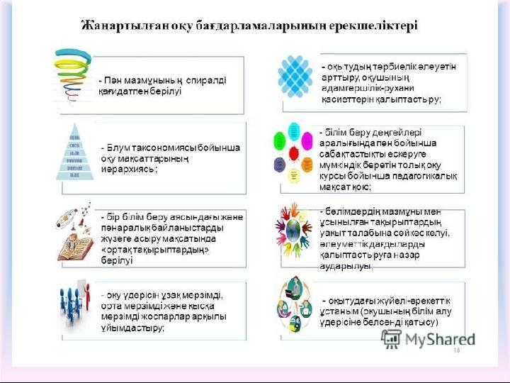1. Пән мазмұнының спиралді қағидатпен берілуі. Яғни пән мазмұны қарапайымнан күрделенуі.