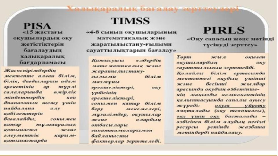 Халықаралық зерттеулері PISA (Programme for International Student Assessment ) 15 жастағы оқушылардың математикалық, жаратылыстану мен оқудағы сауаттылығын бағалау