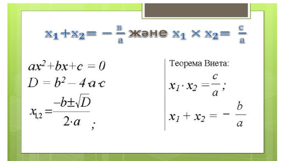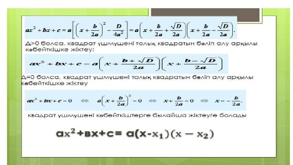 Анықтама : а+вх+с түріндегі көпмүше квадрат үшмүше деп аталады Мұндағы х- айнымалы ; а, в, с коэффициенттер және а≠ 0. Квадрат үшмүшені көбейткішке жіктеуді қарастырайық. Жалпы түрде а+вх+с= 0 + = 0 Виет теоремасы бойынша