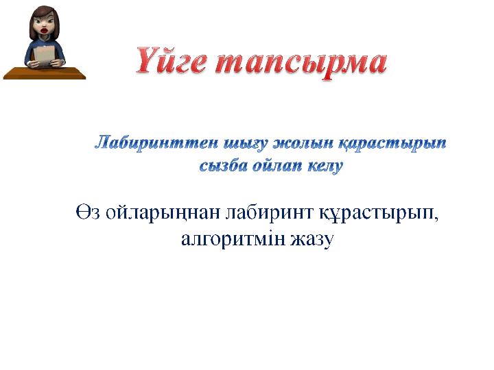 Лабиринт атауын қалай түсінесіндер? Лабиринті не үшін қолданамыз? Лабиринттен шығудың қандай әдістері бар? Күрделі, кедергілі жолдарды лабиринтті не үшін қолданамыз? Неге лабиринттен шығудың түрлі жолдары қарастырылған? Компьютерлік ойындарда лабиринттер не себепті көптеп қарастырылған? Лабиринттерді не үшін «математикалық ми жаттықтырушысы» деп атаған? Сабақты бекіту сұрақтарыСабақты бекіту сұрақтары