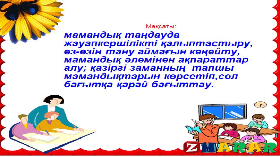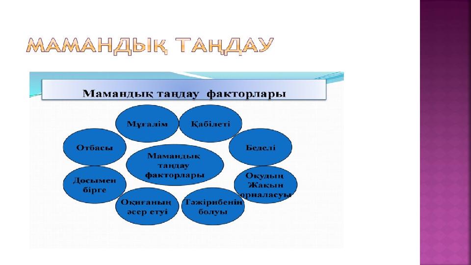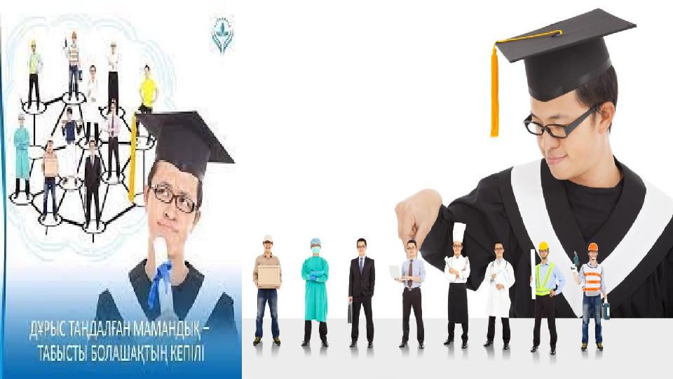 Материалда мамандық таңдау туралы балаға бағыт бағдар беретін слайд."Мамандық" сөзі латын сөзінен шыққан, "жұрт алдында сөйлеу, жариялау" дегенге саяды. Есте жоқ ескі заманда мамандықтың қазіргідей түр-түрі болмады. Әр адам барлық жұмыспен өзі ғана айналысатын. Дегенмен, әйелдер мен ерлерге деп бөлінетін жұмыстар болған. Ерлер аң аулап, үй тұрғызып, қару-жарақ жасаса, әйелдер жеуге жарамды өсімдіктерді жинап, тамақ пісірген, киім-кешек тігіп, бала тәрбиелеген.