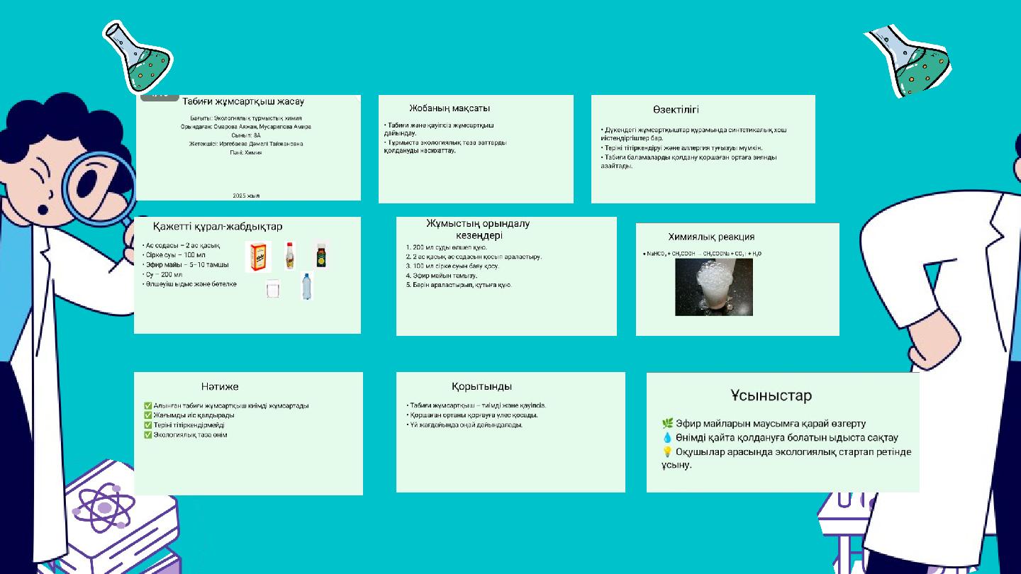 Өмірмен байланысты шағын жоба тақырыптары Тұрмыстық химия және экология •Үй жағдайында табиғи сабын жасау •Қатты судың әсері және оны жұмсарту тәсілдері •Экологиялық тұрмыстық тазартқыш құралдар жасау Тамақ және тағам химиясы •Газдалған сусындардың құрамын зерттеу •Нан, айран, йогурт өндірісіндегі ашу реакциялары •Тағам құрамындағы E-қоспалардың химиялық табиғаты Денсаулық және сұлулық химиясы •Табиғи маска және крем жасау (бал, лимон, сүт негізінде) •Шашқа арналған табиғи бальзам жасау •Тіс пасталарының химиялық құрамын салыстыру Киім және тұрмыс химиясы •Табиғи бояғыштар жасау (жидек, шай, кофе арқылы) •Табиғи иіссу (парфюм) жасау тәжірибесі •Матадағы дақты кетірудің химиялық әдістері