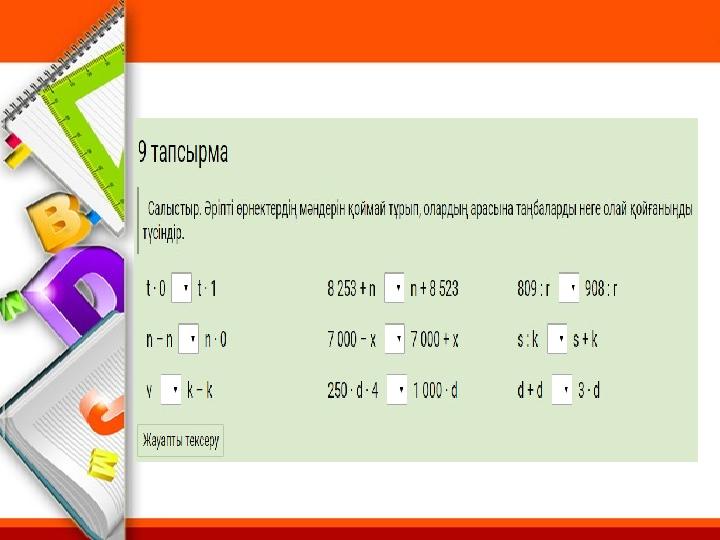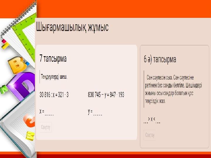 Мақсаты : Қос теңсіздіктердің шешімдер жиынын табуды үйрену. Санды және әріпті өрнектерді түрлендіру. Әріптердің берілген мәнінде бірнеше айнымалысы бар өрнектердің мәнін табу. Бөлімі бірдей жай бөлшектерден тұратын өрнектердің мәнін салыстыруды үйрену.