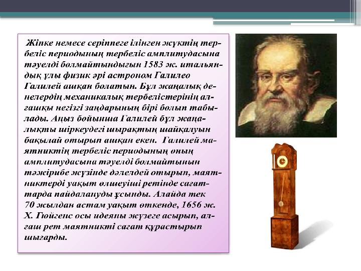Маятниктердің тарихы • Жіпке немесе серіппеге ілінген жүктің тербеліс периодының тербеліс ампитудасына тәуелді болмайтындығын ашқан ғалым