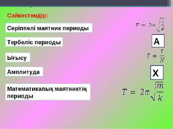 Сабақтың мақсаты: • Тербелістерді,оны анықтайтын физикалық шамаларды қайталау және математикалық, серіппелі маятниктердің тербеліс периодының параметрлерге тәуелділігін зерттеу.